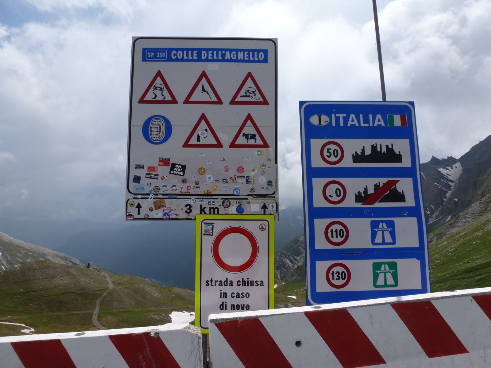 Me voilà au sommet, sur le toit du monde, ou presque, au col Agnel (altitude 2744m). Le Movistar me rattrape une minute après, et après avoir respiré et toussé tout ce que je peux, on discute 5 minutes en mangeant un sandwich. Et il m'apporte une bonne nouvelle, à savoir que le col d'Izoard, qui m'attend maintenant, n'est "qu'à 2300m et des poussières"... c'est moins que ce que je craignais pensais.