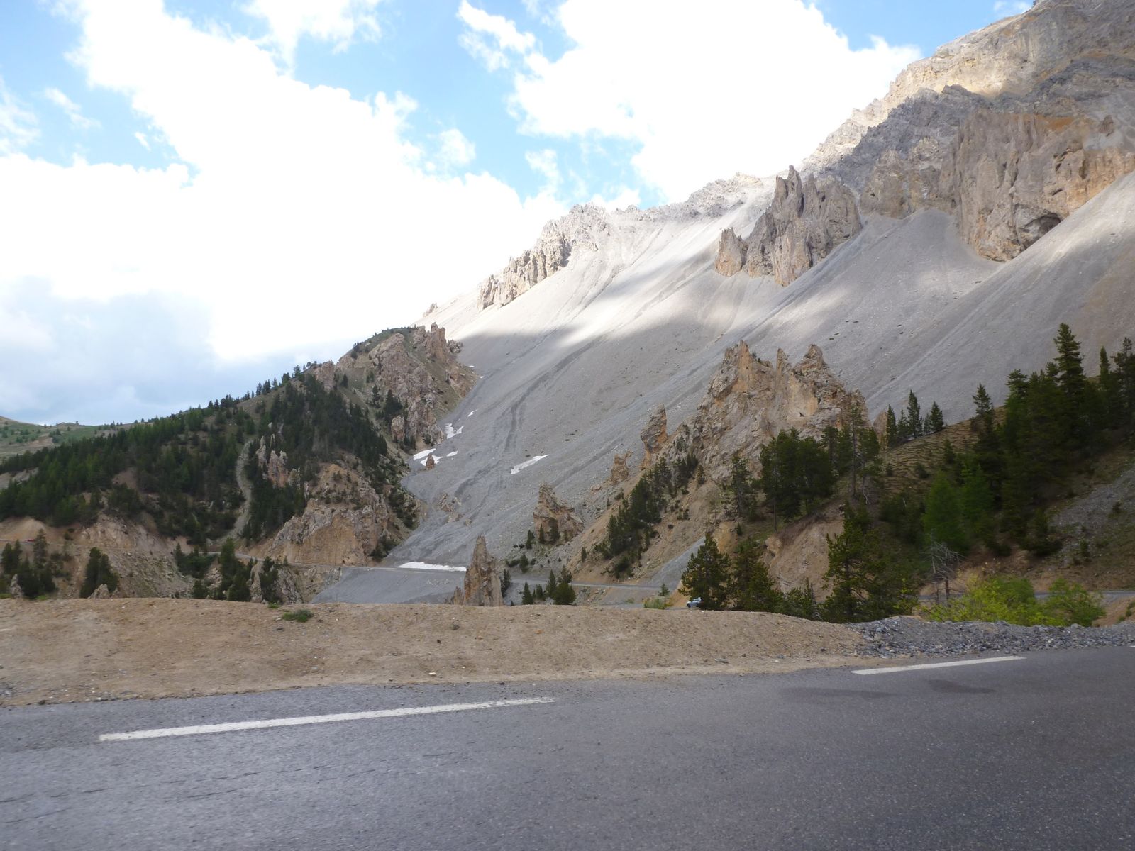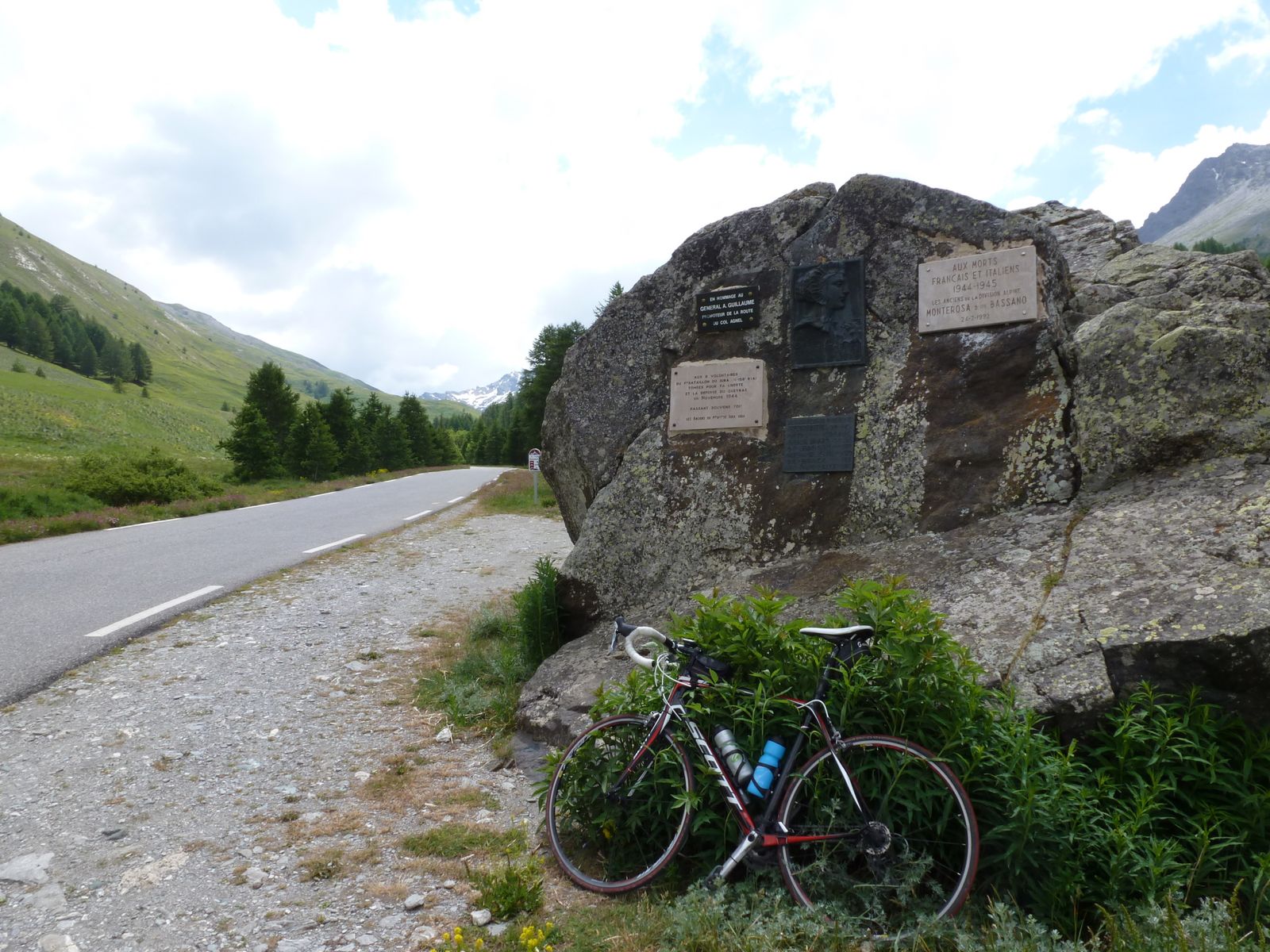 Je me suis bien alimenté et hydraté, j'ai juste les jambes (et les lombaires) cuites. Donc je ne me sens pas du tout en 'danger' de ne pas pouvoir finir... mais ça commence à faire long ! La route grimpe jusqu'au niveau du col de la Platrière (altitude 2220m) - et quand j'arrive à la courte redescente de la Casse Déserte, j'ai de nouveau le sourire. Peut être le visage tordu de fatigue, mais dans la tête, c'est fait. Je laisse le britannique derrière moi, c'est bien le seul que j'ai doublé aujourd'hui, avec l'allemand sur Agnel... sinon tout le monde roulait plus vite que moi aujourd'hui !