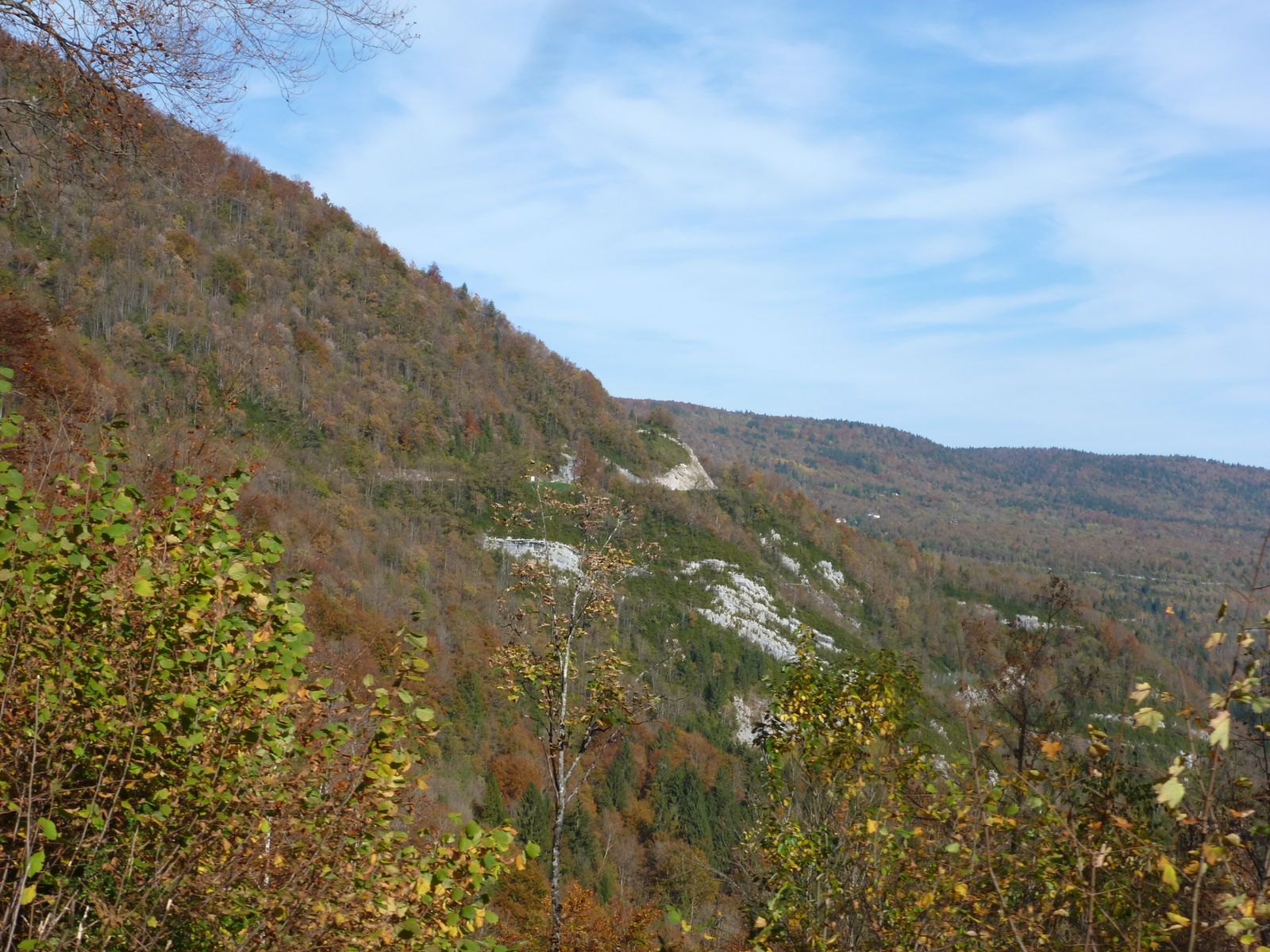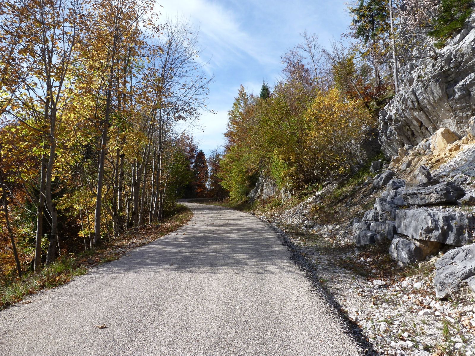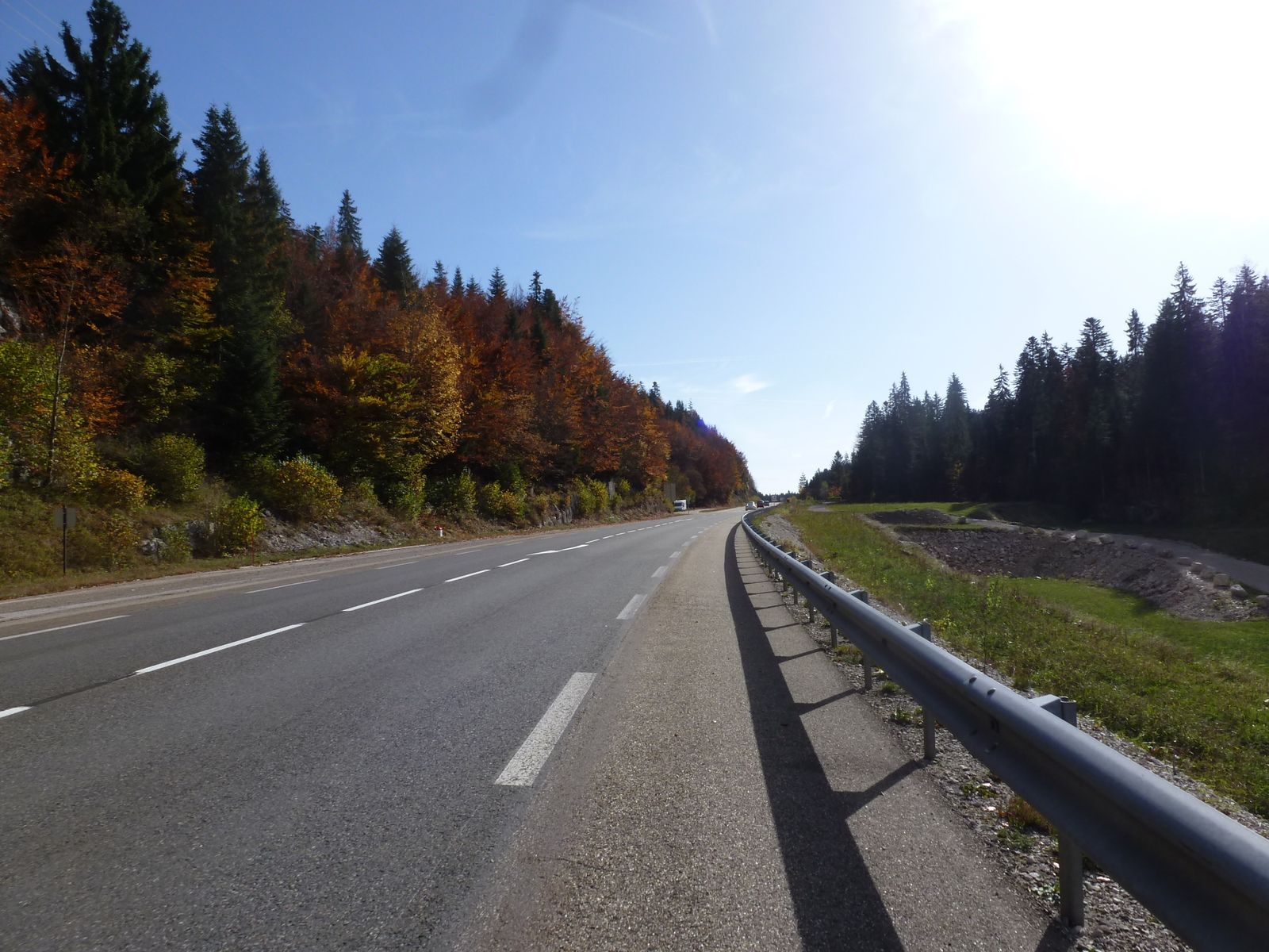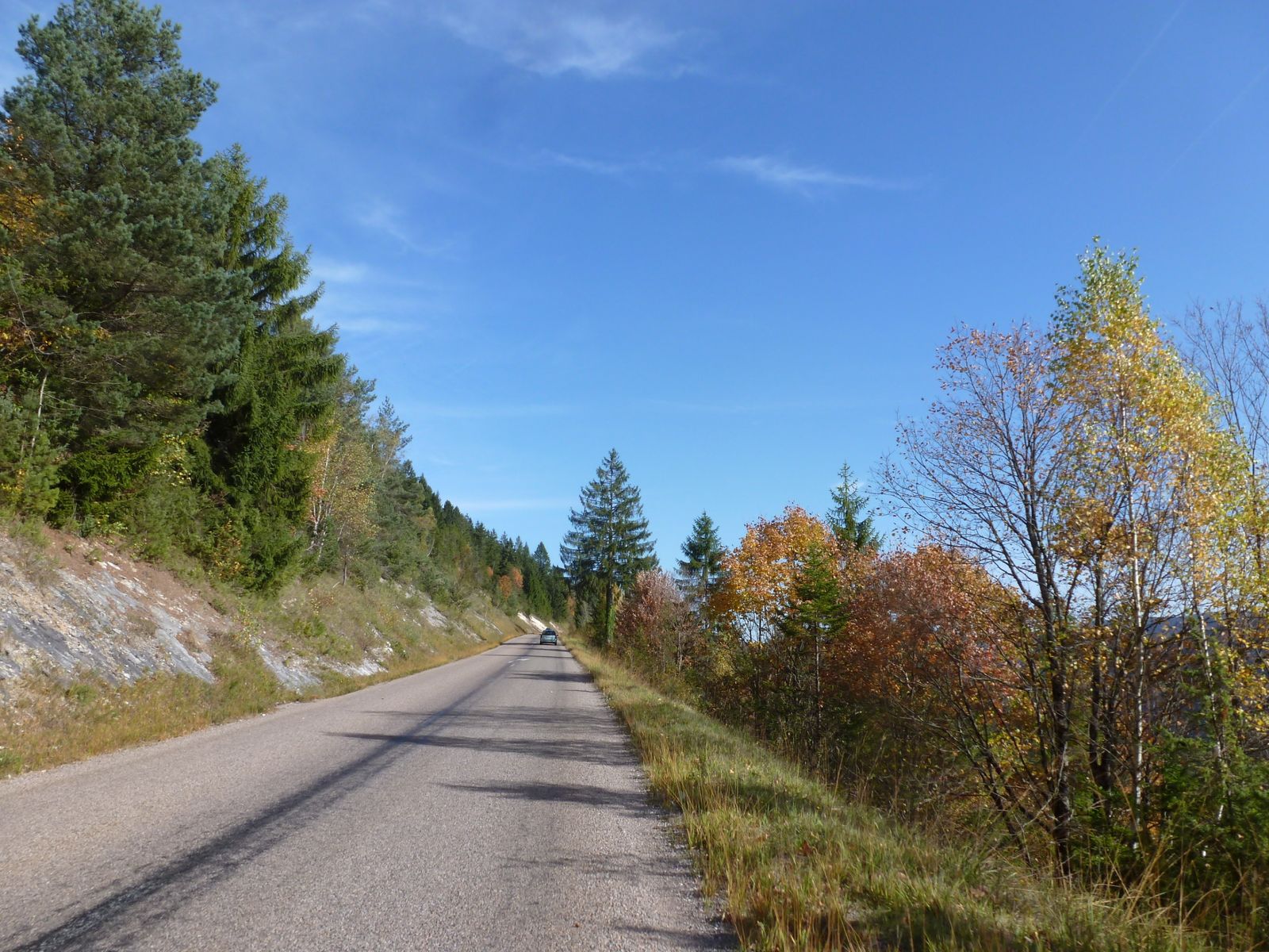 Puis je grimpe; la pente est assez forte jusqu'à Communal, puis se calme. La forêt est magnifique, aux couleurs rouges; les feuilles mortes couvrent au moins 1/3 de la largeur de la route, et en plus c'est très calme - cette portion de route est vraiment à conseiller à qui souhaite découvrir le Jura à vélo.