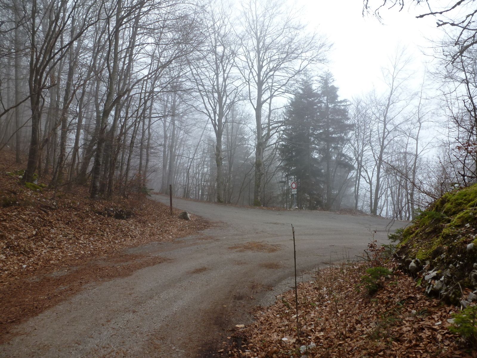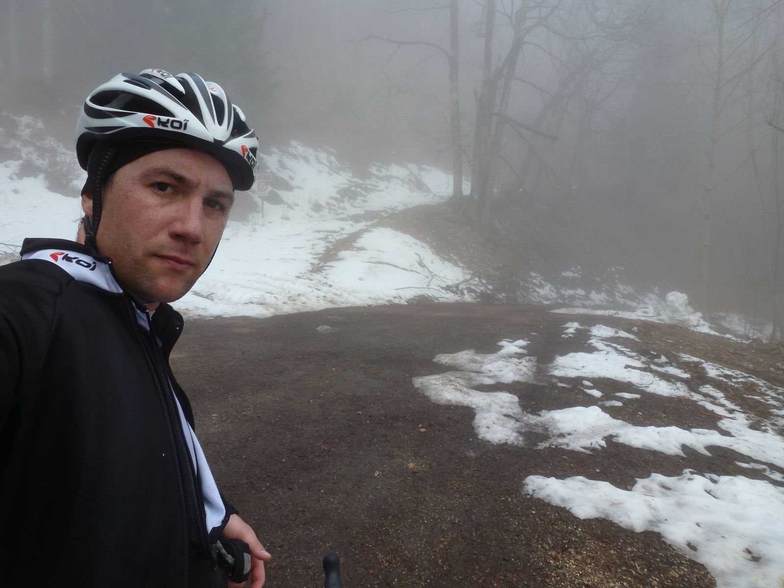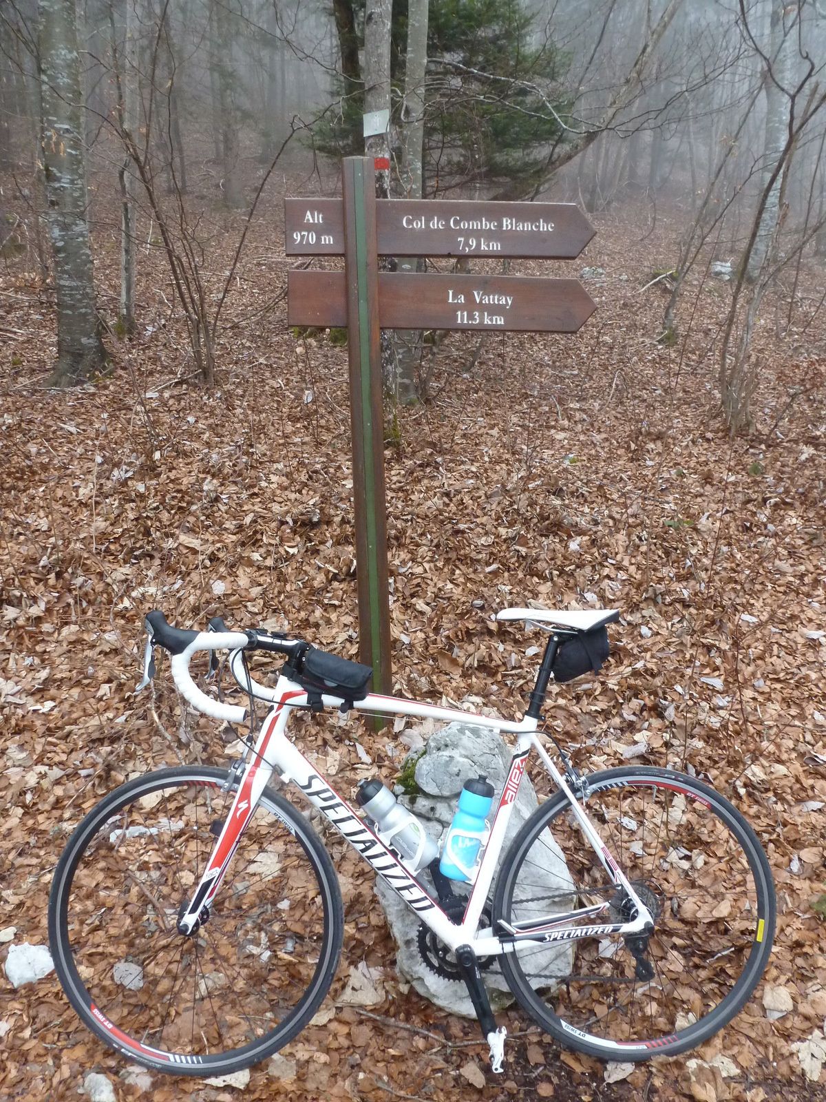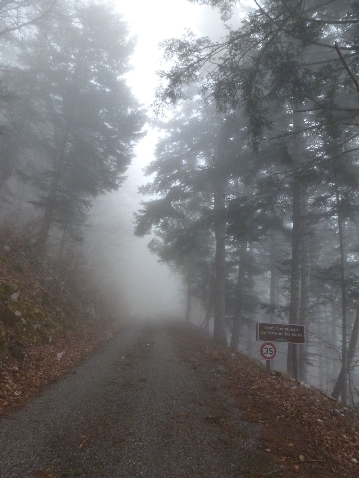 Malgré le brouillard, le froid, les mini-courbatures laissées par le chrono à la Faucille hier, et les restes de fondue savoyarde que j'ai sur le bide d'hier soir, l'envie de pédaler est là. Après un repas assez tôt, je file... sans trop d'idée en tête.