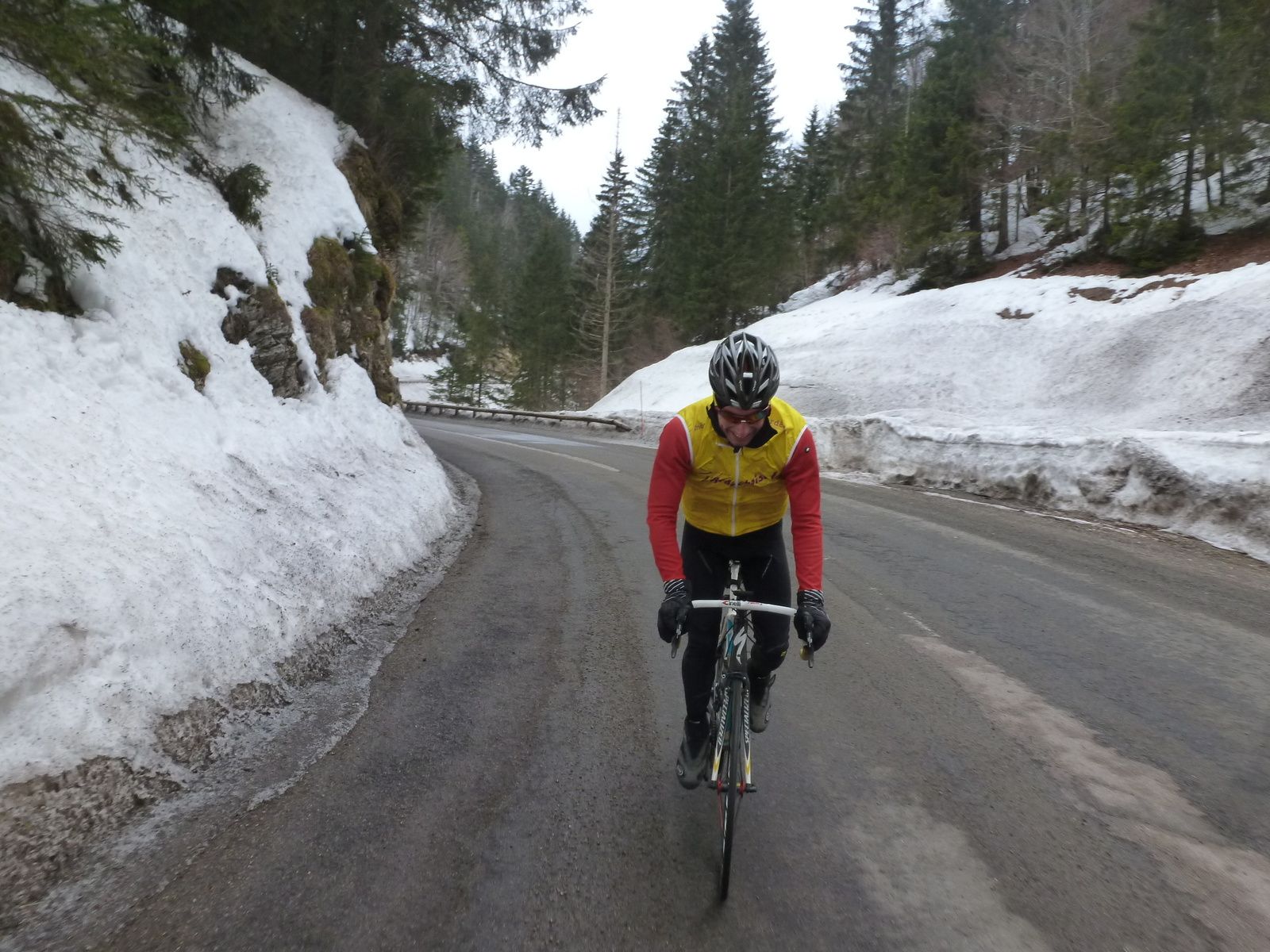 Il neige toujours en retombant sur Mijoux... d'ici; il reste la remontée sur la route de la Faucille... jamais facile, je la trouve toujours dure mentalement... on attend avec impatience que l'épingle qui tourne à droite se dévoile enfin à nos yeux, elle annonce l'approche finale de la route de la Faucille, où la route replate. Mais non de non, ça n'arrive pas !!! Et il continue de neiger, ça tient sur ma veste, maintenant. Incroyable.