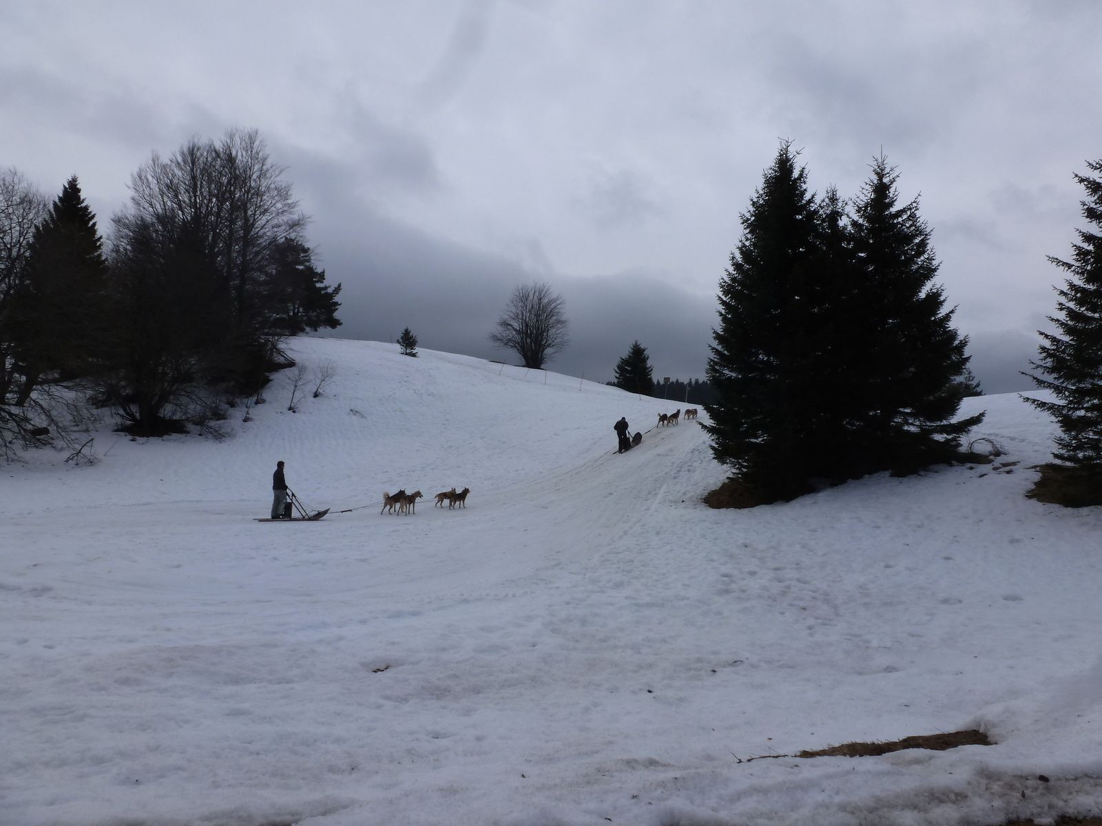 Plus loin, j'observe sans m'arrêter 3 équipes de chiens de traîneaux... et je souris en pensant à la course de 'mushing' (chien de traineaux) de l'Iditarod, en Alaska, qui est sur le point de se terminer justement... la course la plus réputée au monde... où les participants doivent lutter contre les éléments... le froid... des vents hallucinants... je me dis qu'aujourd'hui dans le Jura on a déjà à se battre contre des éléments difficiles.