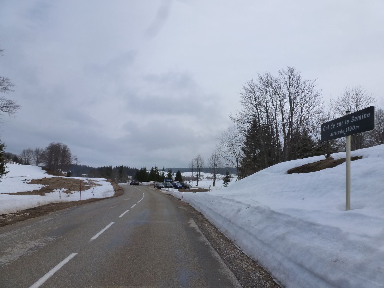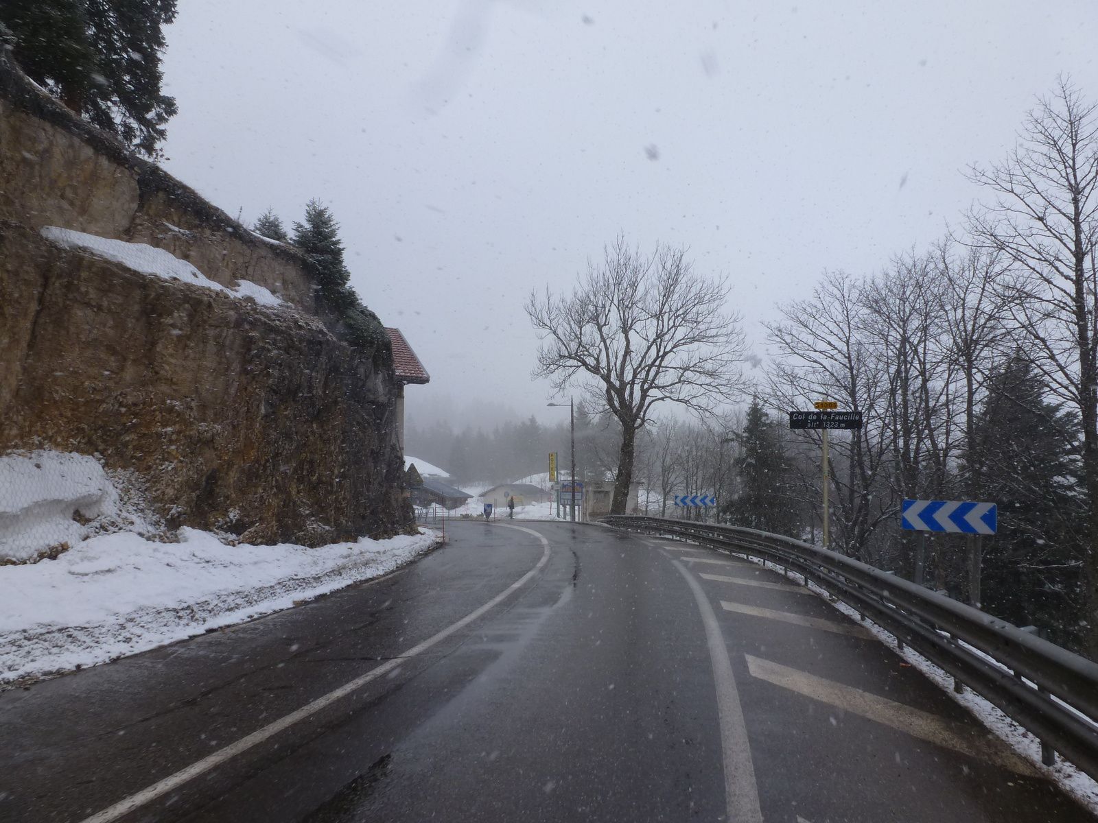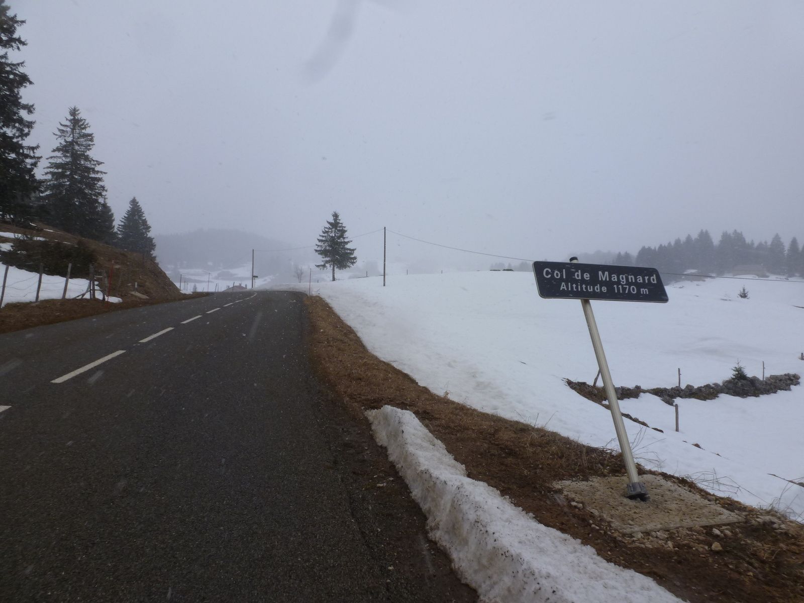 Au sommet, avant Lajoux, il n'y a plus trace du vélo géant, qui avait été posé pour le passage du Tour de France... par contre, un panneau de col a été installé... un col non répertorié, d'ailleurs. Je récupère Yann peu avant l'intersection avec la route de Prémanon... il m'indique qu'il va couper court... la neige redouble, elle tombe maintenant par gros flocons... -1° au compteur... il file à gauche alors que moi je continue tout droit.