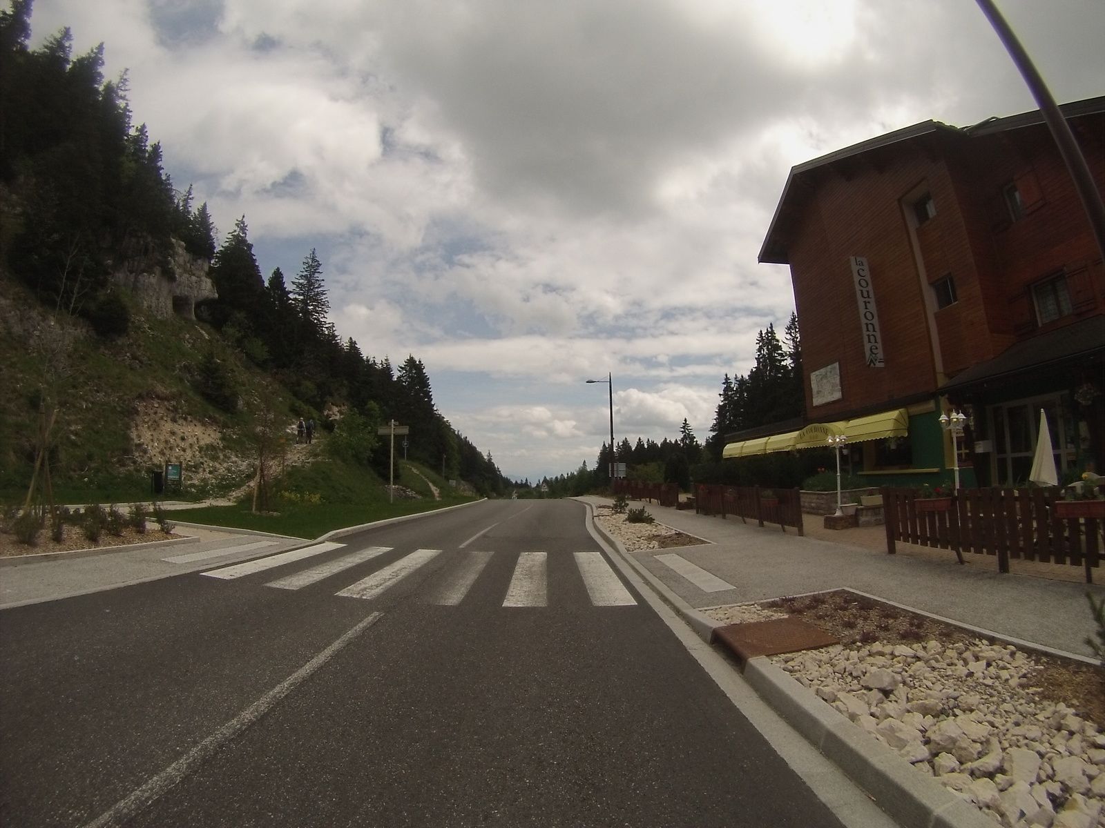 Pas besoin de pause, je file dans la descente, et atteint bientôt le centre de ski de fond de la Vattay, où je tourne à gauche pour récupérer la route de la Faucille. Mains en bas du guidon, je dirais bien que ça file vite sur les 2.5km jusqu'au col de la Faucille, mais non, je ne fais que limiter la casse. En prenant bien garde de bien tourner les jambes 'en rond'. Je remets les manchons pour la descente... où je resterais coincé derrière une voiture dont le chauffeur n'a visiblement pas l'habitude de rouler en montagne... grrrr.