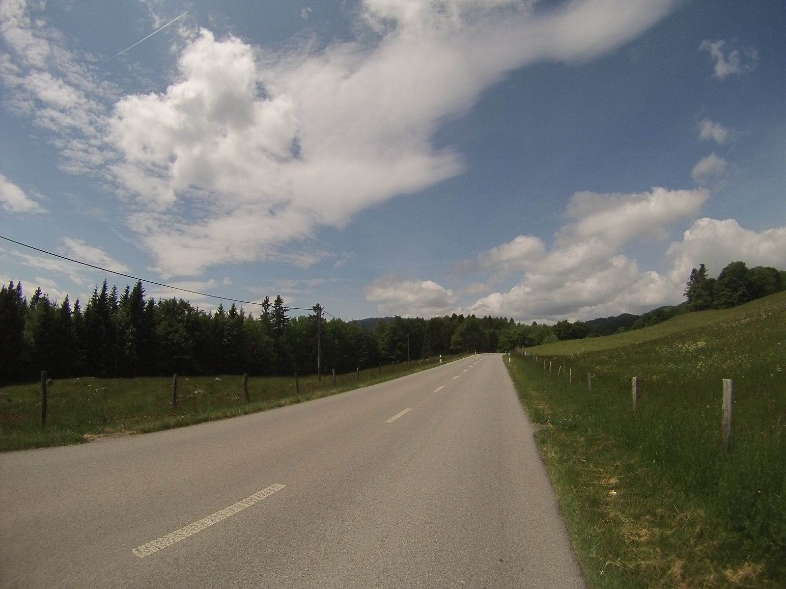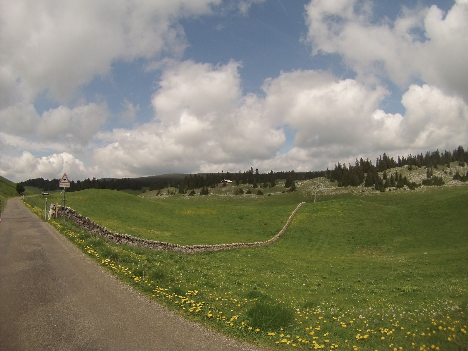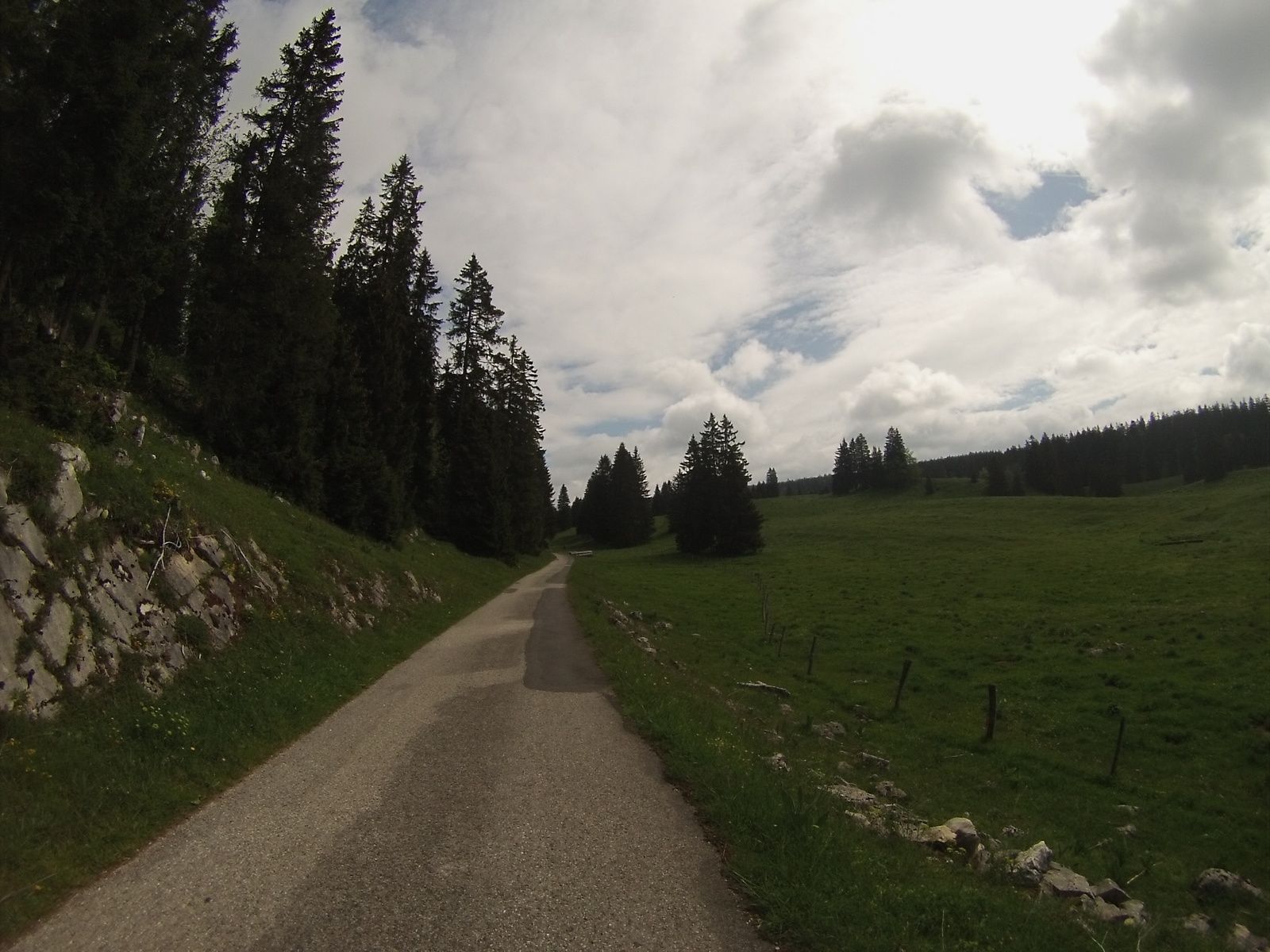 Hors un bidon d'eau qui a sauté de son porte-bidon à l'occasion d'une bosse sur la route juste avant de récupérer la route principale 2km en dessous du col du Marchairuz, je n'ai pas fait de pause encore. Les jambes sont bonnes, d'ailleurs même ces 2km ils passent bien, et 'vite' (pour moi)... là encore je n'avais jamais passé cette section si vite.