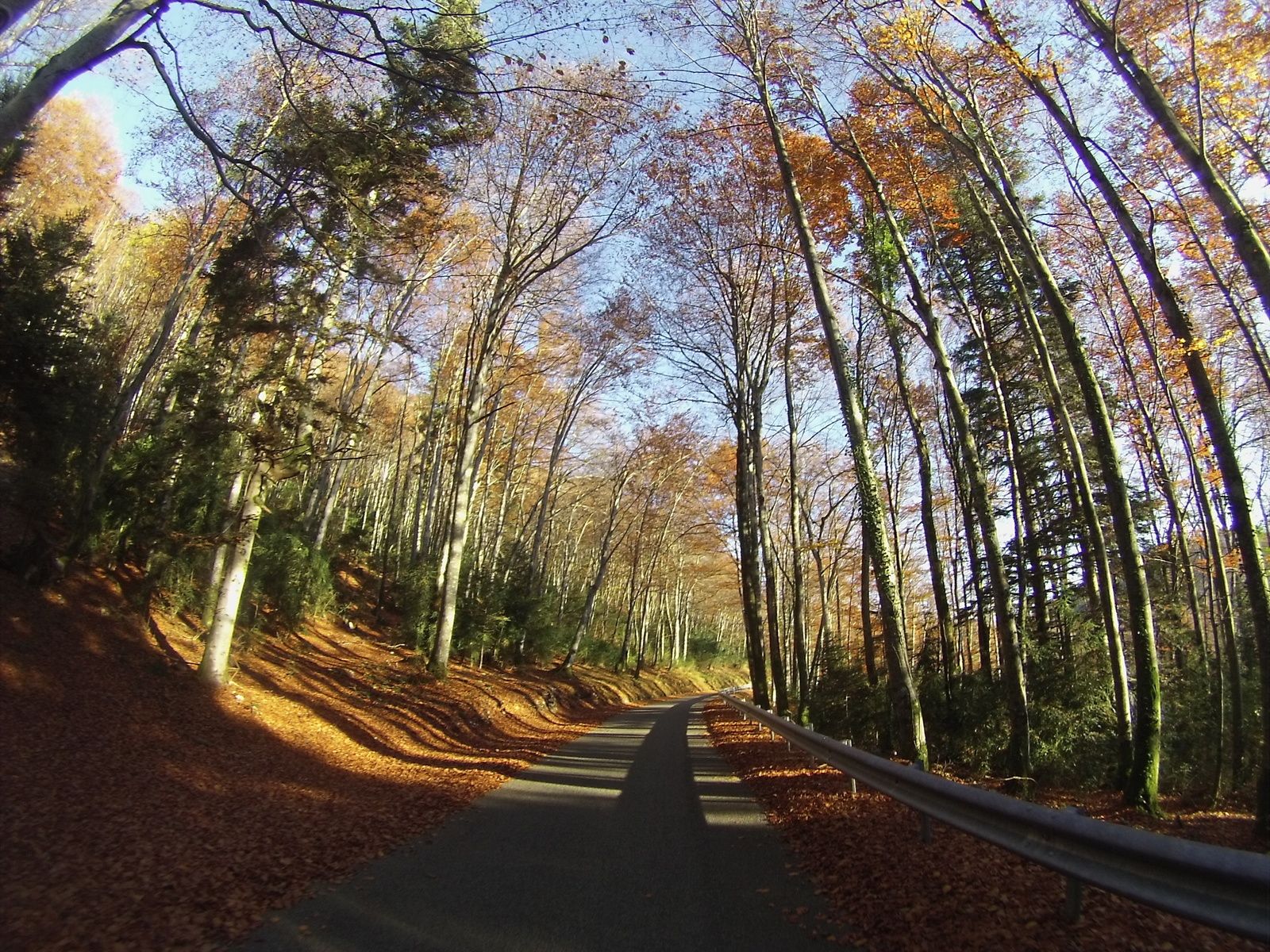 Remplissage des bidons au cimetière, puis nous repartons sur la magnifique ascension Meussia-Etival. Là encore, route perdue dans les bois, couleurs au top... on profite.