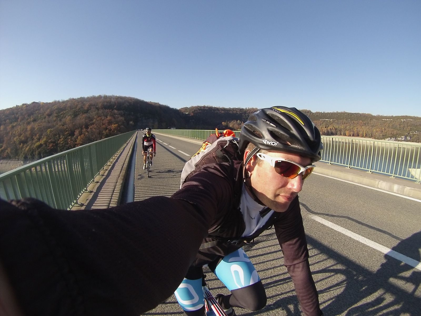 La pause s'éternise un peu... c'est rigolo comme Yann & moi avons des manières de faire si différentes. Lui roule à gros rythme, je suis obligé de partir au charbon pour ne serait-ce que tenir sa roue. Mais il prend de grosses pauses... moi c'est tout le contraire. Mais cette pause au soleil, ça requinque quand même, alors je profite des 'faux' 22° affichés au thermomètre, sur le GPS. On repart sans surchaussures, veste thermique ni buff sur la tête.