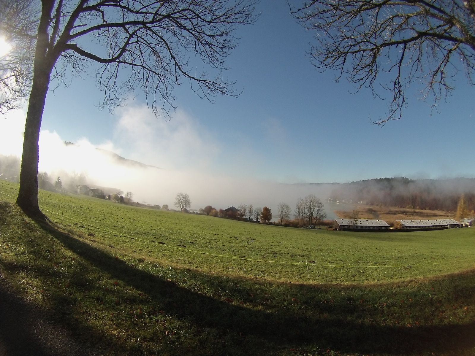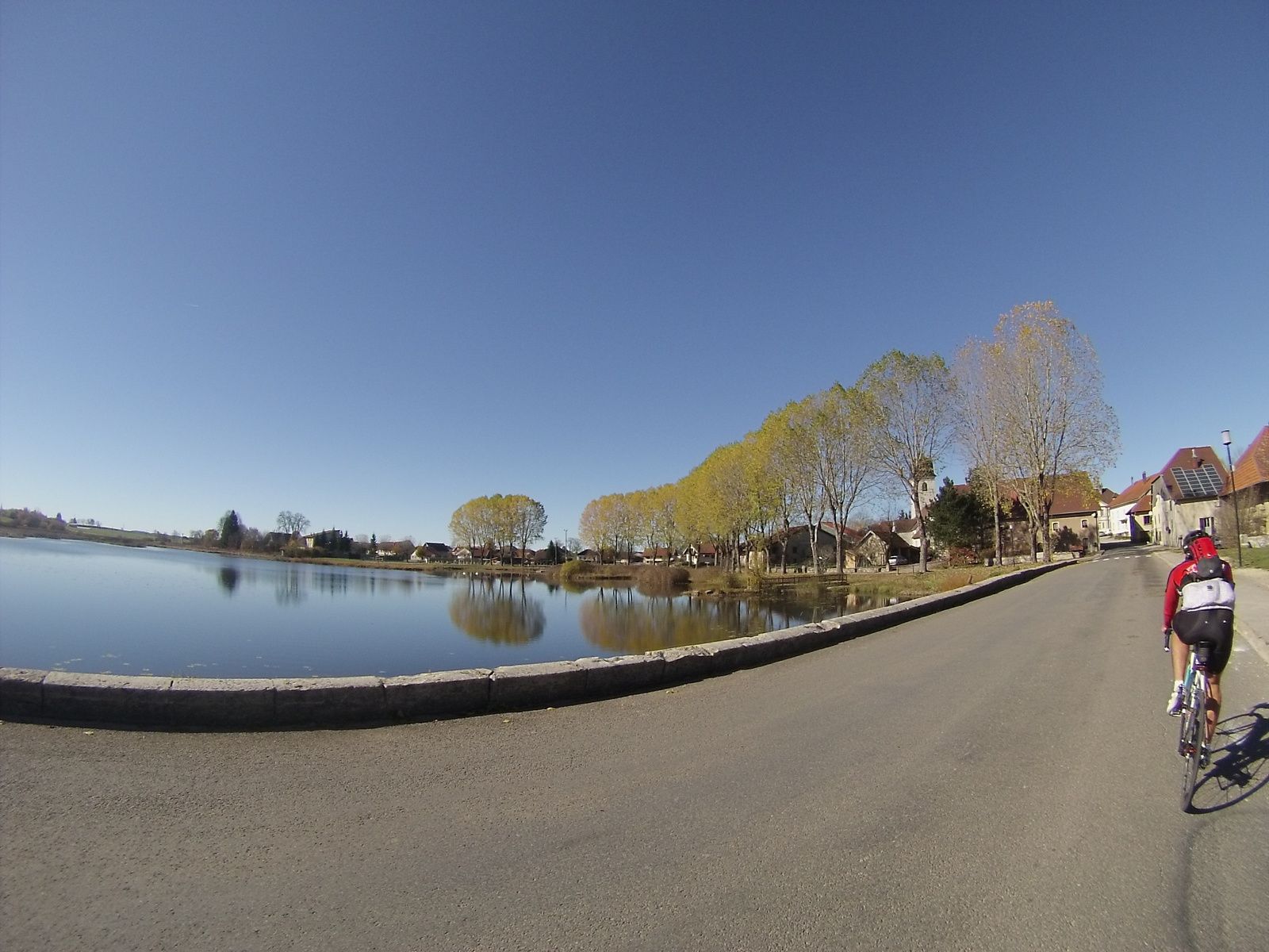 Micro-pause puis nous parvenons au bout du lac, pour remonter sa rive nord (prise dans la brume), puis avant Montperreux, tourner en épingle à gauche pour emprunter la petite bosse menant jusqu'à la très passante N57. Il y a deux ans, nous avions pris à droite, là nous partons à gauche pour rallier la Cluse et Mijoux très rapidement... il fait glacial en fond de vallée, probablement pas plus de 2-3° alors que sinon le mercure remonte doucement à 6-7° au soleil.