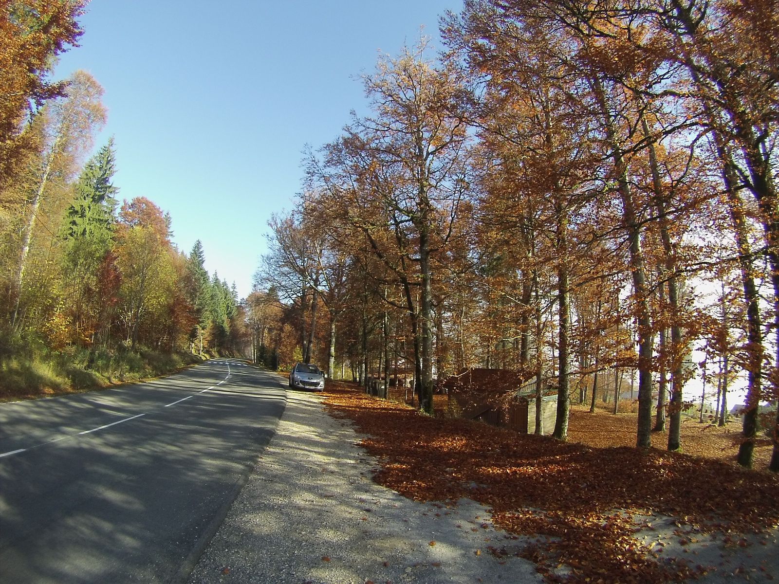 Traversée du carrefour de l'Abbaye, qui me rappelle l'un de nos raids passés avec Yann. On file tout droit pour longer le lac de Saint Point... la lumière du soleil brille 'pleins phares' à travers les arbres qui nous séparent tout juste du lac, et dont les feuilles ont du mal à maintenir leur effet couvrant. Les routes sont bordées de feuilles 'tombées au combat' - il faut dire que le combat est rude dans le Jura. Bref... explosion de couleurs.