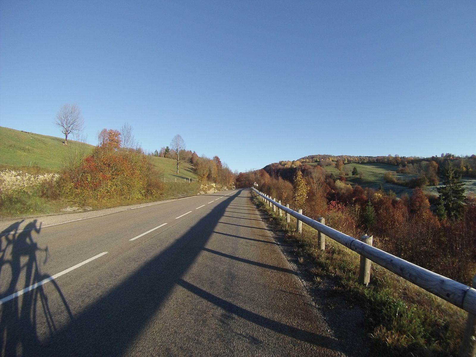 Après Foncine le Bas, nous descendons les gorges de la Saine, non sans faire arrêt au point de vue sur la droite. Magnifique - les couleurs rouge-orangé se mêlent à la roche typique du '39'... Pause technique, puis détour à gauche pour aller observer un canyon très étroit... 'et au fond coule une rivière'. Nous revenons sur nos pas emprunter la D17, première belle bosse de la journée. Comme d'habitude, je laisse filer Yann, bien plus véloce que moi (et encore plus en montée), tout en adoptant mon rythme habituel. La montée est assez longue, mais nous sommes récompensés au sommet par de beaux rayons de soleil jaune, reflétés sur les paysages d'automne. Ainsi que quelques vaches (encore !) qui paissent calmement dans les champs.