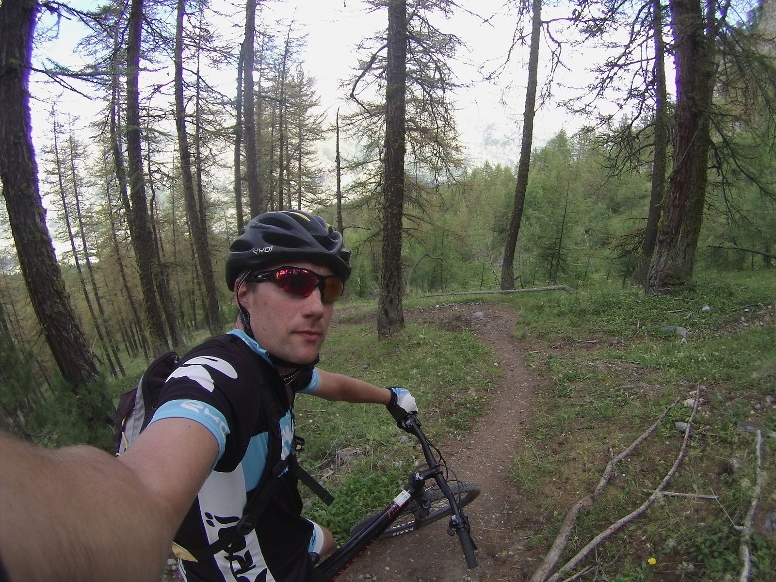 Ai-je pris trop d’assurance ? Honnêtement, je ne pense pas à en juger par le nombre de lacets que je passe à pied. N’empêche que rapidement, je vais faire un joli ‘soleil’, et une belle chute au ralenti, emporté par la pente et mon frein avant plus que par mon élan, quasi inexistant. Les bobos sont très limités, je remonte en selle. Deux lacets plus loin, c’est autre chose… second soleil, mais cette fois ci dans un arbre, et je fais deux roulades sur le côté avant de pouvoir m’arrêter dans la pente en contrebas. Je remonte, le vélo avec.