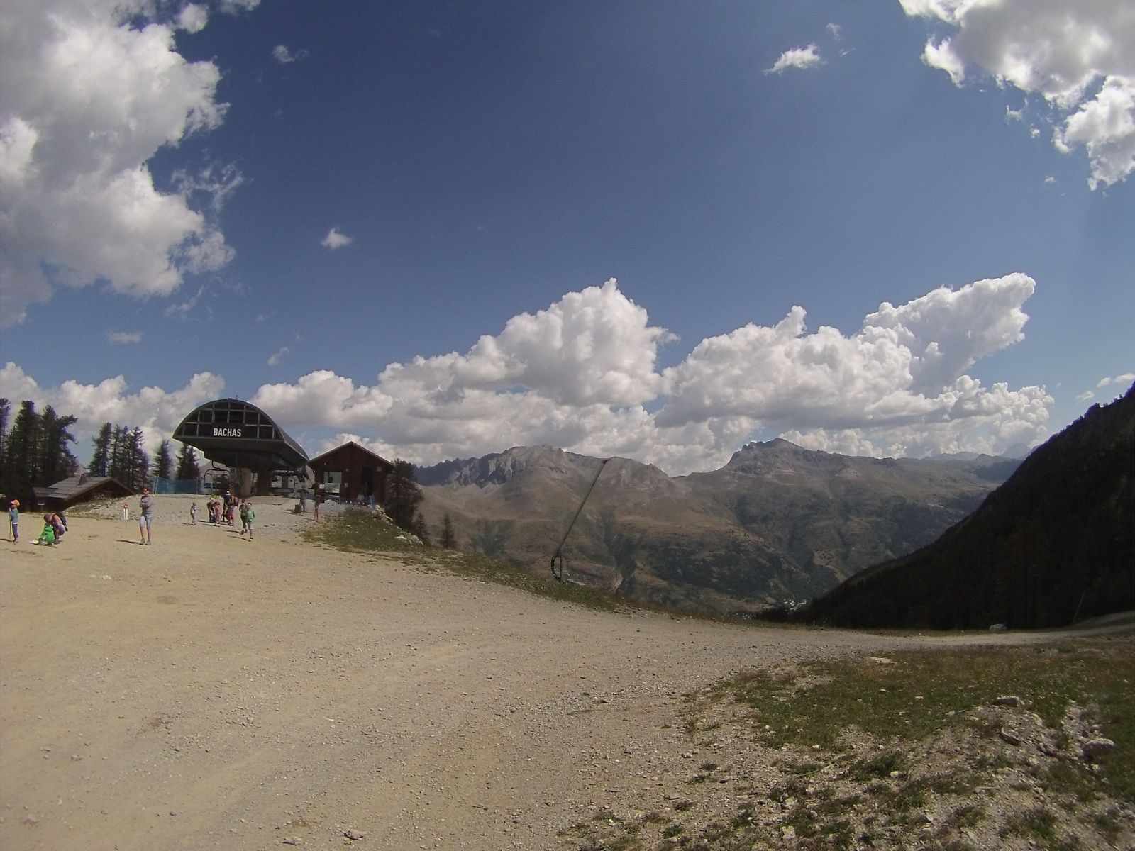 Je pars pour rallier le bachas, dont l’emplacement se situe au niveau de l’arrivée d’un télésiège, à environ 2170m d’altitude. Ce qui me fait déjà 700m de dénivelé positif dans la vue, à grimper en moins de 6km… faites le calcul vous-même. Ca tape droit dans la pente, sans le moindre replat pour souffler. La piste de terre que l’on m’a conseillé au début est superbe et roulante, ce qui me permet de prendre doucement le contrôle de mon deux-roues inédit. Mais elle se transforme très rapidement en piste caillouteuse, aussi large que raide, et difficile tellement les pierres gênent la progression. Je suis bientôt tout à gauche à donner 100% de ce dont je suis capable simplement pour rester en selle et grimper raidard après raidard. J’avais oublié à quel point le VTT, surtout en ‘enduro’ comme ici, est hardcore au niveau cardio. Pas vu un seul VTTiste ici, ni en haut… ici c’est le royaume des randonneurs, mais pas des vélos semble-t-il. Pourtant, le télésiège tourne, pour déposer ceux qui veulent faire du VTT de descente au sommet.