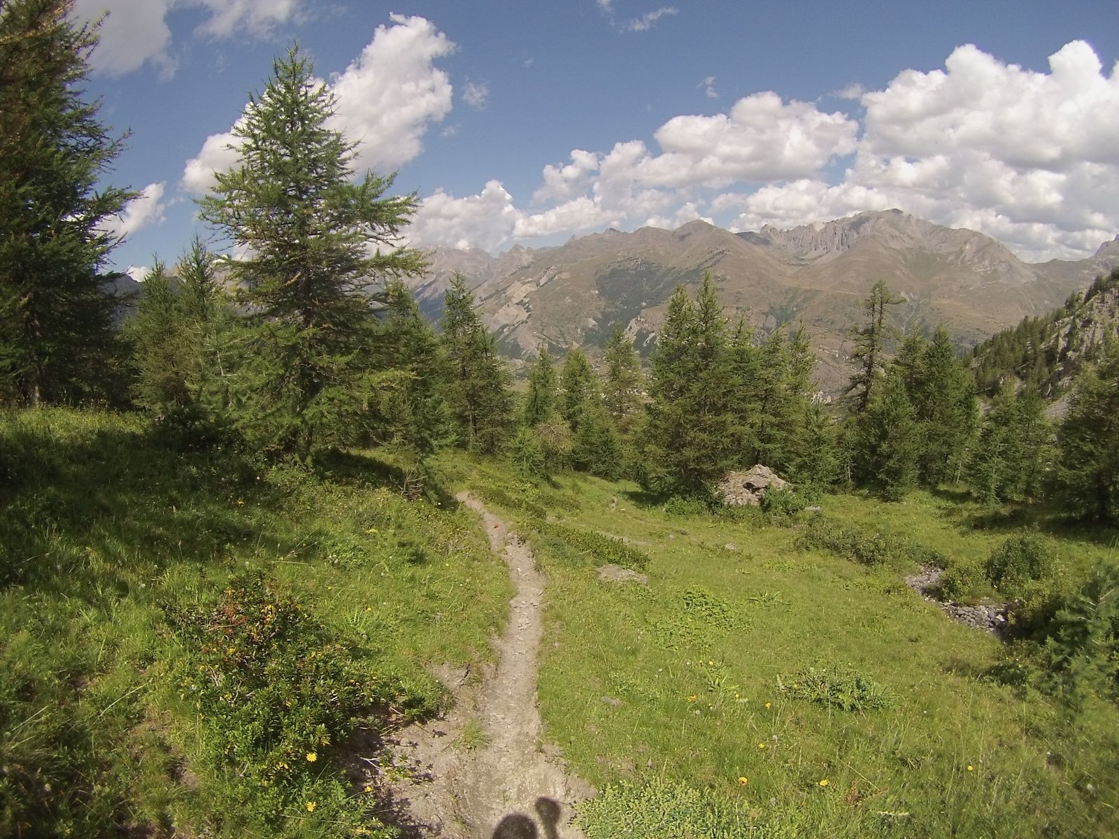 Puis le tracé enduro n°36 ‘La Tripe Chaude’ fait son apparition. C’est celui que j’étais venu chercher, puisque, partant sur la droite, et évitant le sommet qui me faisait face, il va m’emmener tout droit au col du Grand Pré. Ce singletrack est réellement étroit et technique. Il traverse un ou deux courts pierriers, mais surtout, le sentier s’enfonce de part le passage des randonneurs à travers les années, et il est donc impossible par moment de pédaler : les pédales toucheraient les bords de cette petite piste de bobsleigh… Puis finalement je prends doucement le pli, et c’est en faux plat que j’atteins le rebord de la montagne, puis en descente que j’arrive au sommet du grand pré en question… le col du Grand Pré, juché à 2544m d’altitude, m’accueille à bras ouverts ! Cris de marmotte, vue de malade sur la vallée en contrebas et des montagnes avoisinantes… je suis littéralement sur le toit du monde !