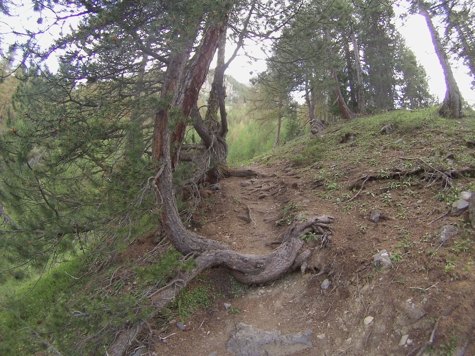 … ici les lacets sont extrêmement resserrés, et la pente toujours aussi difficile. Sans parler qu’on est dans la forêt, et qu’il faut donc gérer ce qu’il y a au sol (cassures de terrain formées par des racines) mais aussi ce qu’il y a en l’air (ne quand même pas se prendre une branche en pleine tête).
