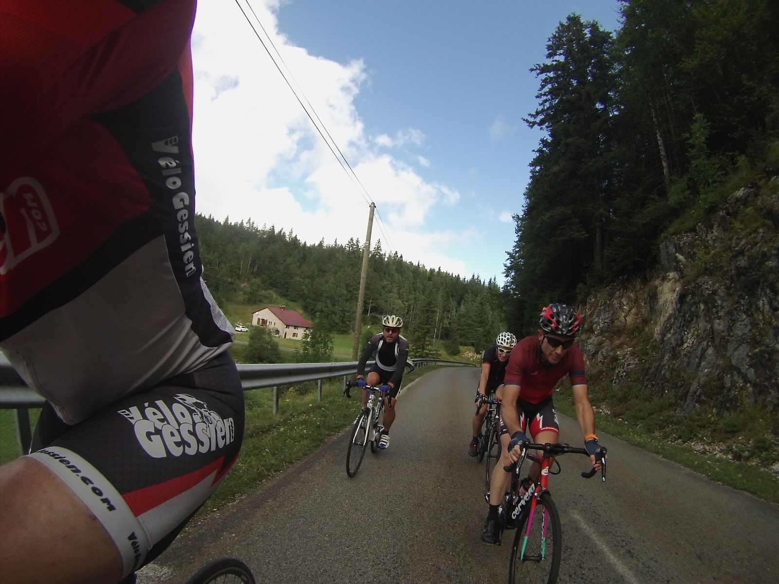 Je suis un peu dans le dur, les gars roulent trop vite pour moi... mais c'est un bel exercice ! Retour et café à Lajoux. Reste la descente sur Mijoux et la remontée sur Lajoux, où je vais exploser mon record après une grimpée à rythme soutenu, et de bonnes accélérations sur la fin. J'arrive avec le cardio explosé en haut, 98% de ma fréquence cardiaque maximale, c'est l'équivalent d'un sprint total. Argh.