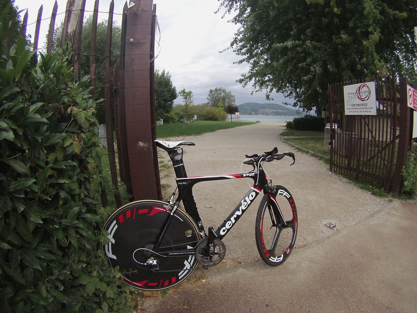 Maël de Liberty Bikes à Gex m'a prêté un magnifique Cervelo P2 pour l'occasion, avec roue lenticulaire et roue à batons devant. Ça promet des sensations maximales sur ces 13.6km à bouffer à fond. Contrairement à il y a deux ans, j'ai eu le temps de le prendre en main, et je me sens à l'aise dessus.