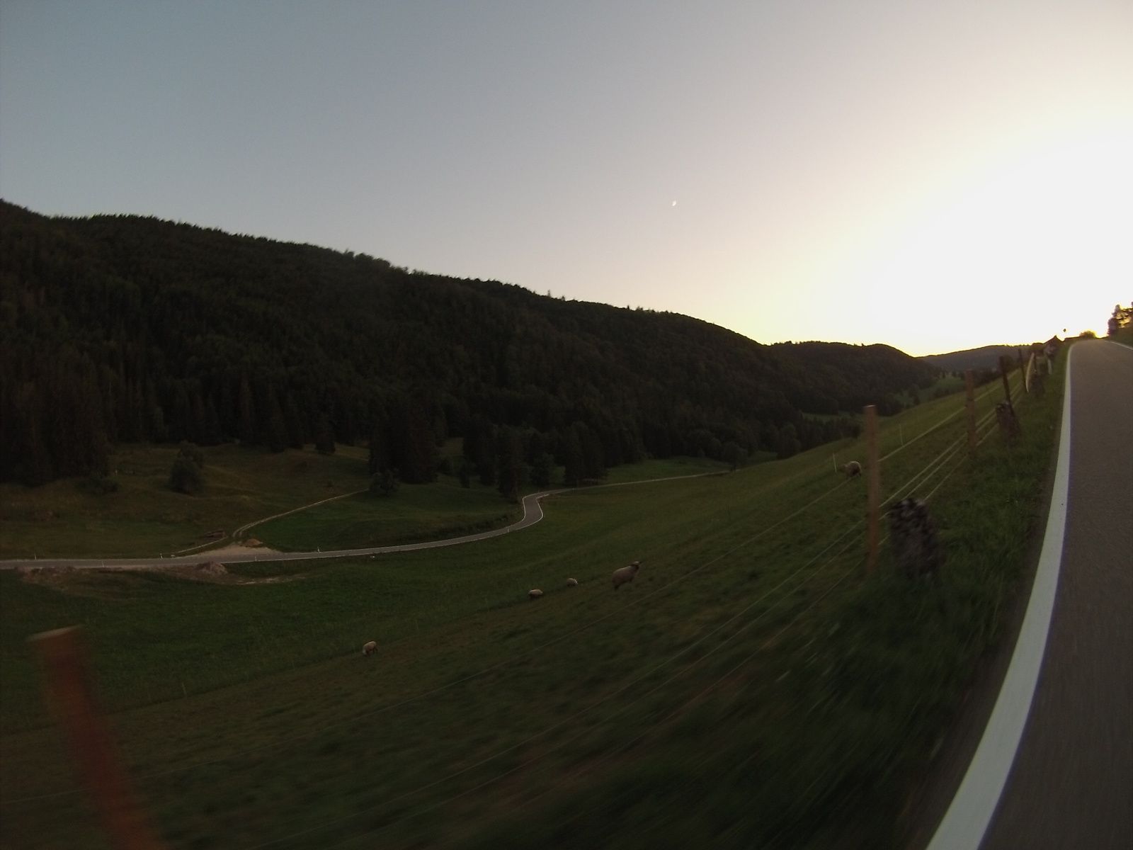 Je cherche de l'eau sans en trouver. Argh. En plus de mon feu de route avant, j'allume de temps en temps la frontale, fixée sur le casque, pour observer dans le noir à droite à gauche, dans les recoins des batiments croisés dans ces villages suisses, pour chercher une fontaine. Sans succès pour le moment. Je mange aussi une barre ou deux, n'ayant pas pris de 'petit dej'.