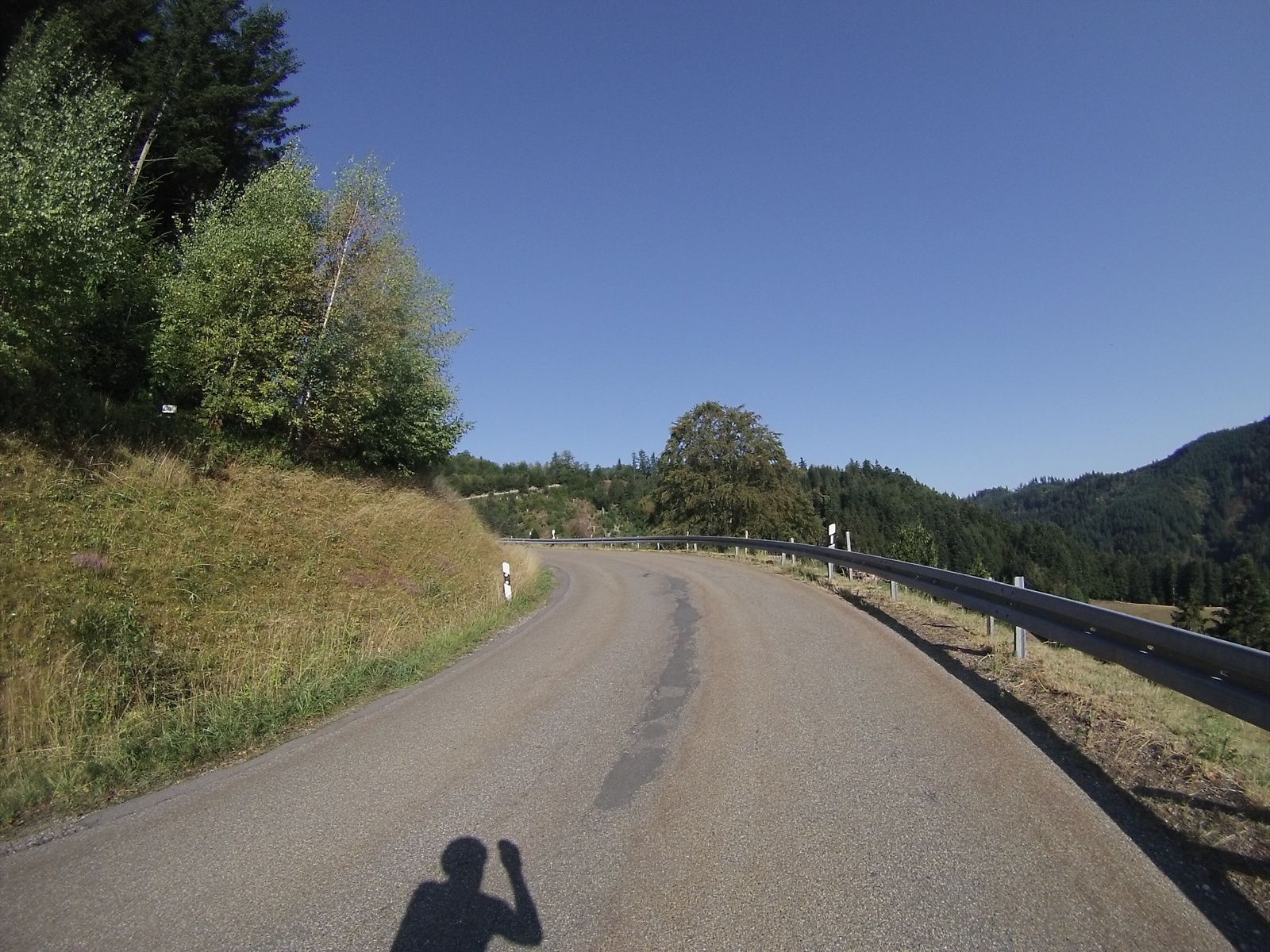 Gros problèmes d'orientation à Oberdottingen. Je me retrouve d'abord sur un chemin de cailloux. Demi-tour. Puis je ne trouve plus la piste cyclable, zoome et dézoome sur le GPS... gueule un bon coup à voix haute et repars. Allez, virage à droite, et la route s'enfonce enfin un peu entre les montagnes alentours. C'est à partir de Münstertal que ça va piquer sévère ! Virage à droite, et après avoir franchi des gorges sur une jolie petite route en montée douce, le gradient va s'infléchir sérieusement. C'est la grimpée vers le Heubonner Eck (altitude 814m), le tout premier col allemand qu'il me sera donné de franchir.